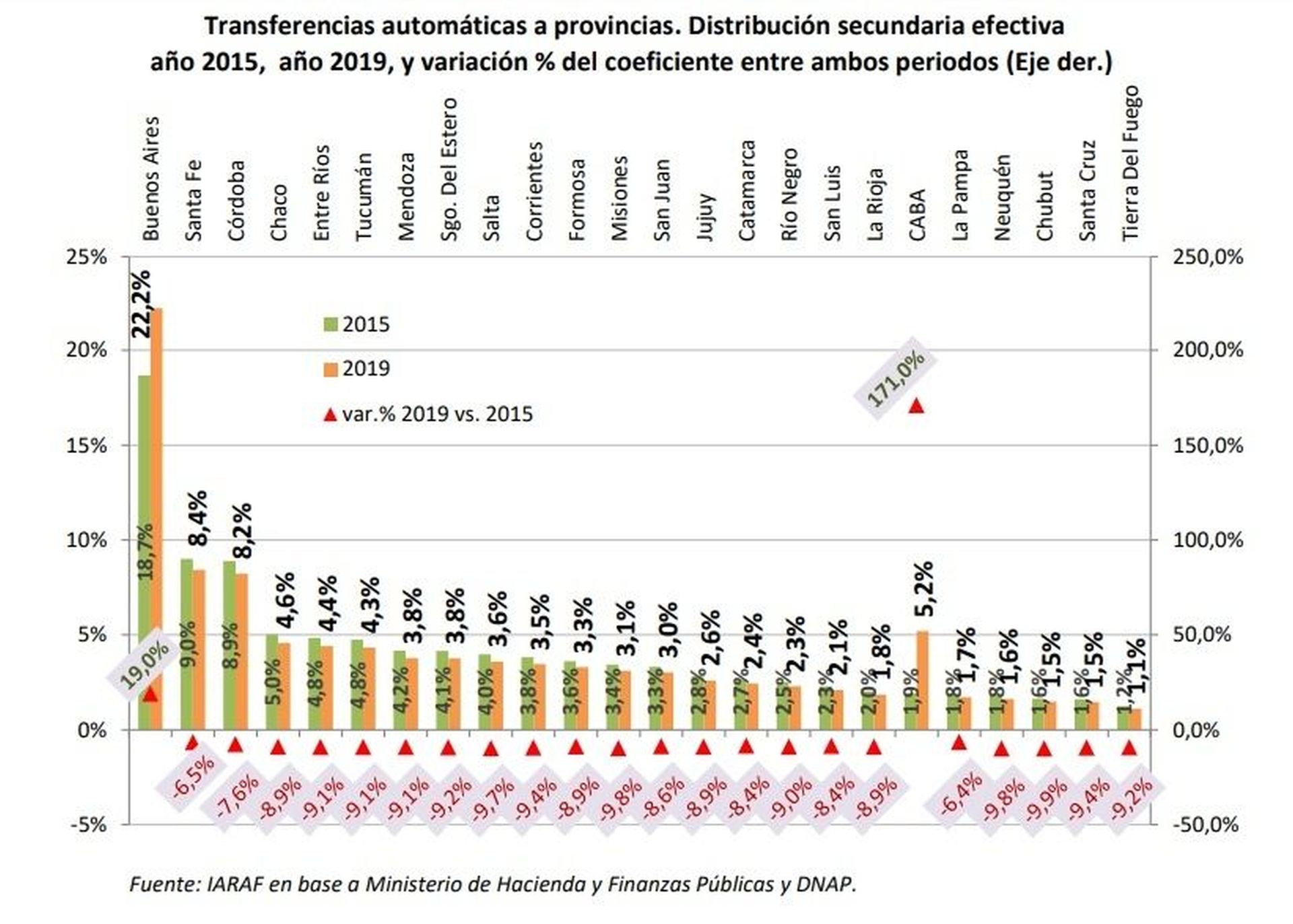 El Instituto Argentino de Responsabilidad Fiscal (IARAF) recopiló los flujos de fondos de Nación a provincias que tuvieron lugar entre fines de 2015 y fines de 2019. La Provincia y la Ciudad fueron las jurisdicciones más favorecidas.