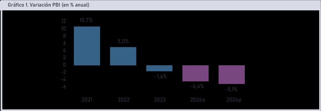 El estudio realiza un análisis macroeconómico del país donde se destaca la caída económica del 1,7% en abril contra igual mes de 2023, y la proyección de una contracción del PBI entre -4,4% y -5,1%, empeorando las proyecciones previas.