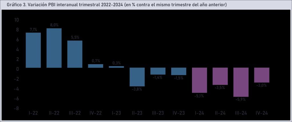 El estudio realiza un análisis macroeconómico del país donde se destaca la caída económica del 1,7% en abril contra igual mes de 2023, y la proyección de una contracción del PBI entre -4,4% y -5,1%, empeorando las proyecciones previas.