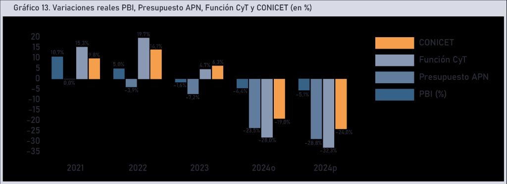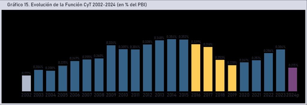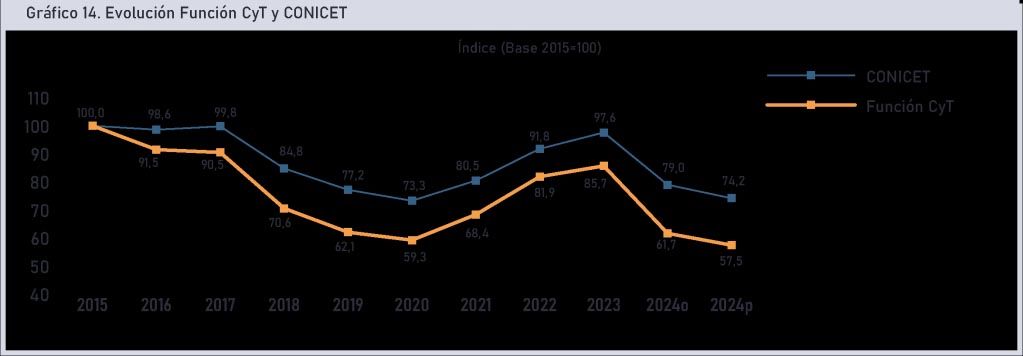 La gravedad del ajuste se expresa de manera aguda en el sistema nacional científico, «demostrando el carácter pro-cíclico histórico de la inversión en el sector CyT, donde ésta cae en términos reales más de lo que cae el Presupuesto total de la APN, cayendo ambos más a su vez de lo que lo hace el PBI». Respecto de proyecciones anteriores se consolidan escenarios donde la caída de la inversión CyT es aún más marcada: empeora entre 2 y 5 puntos en las diversas proyecciones consideradas.