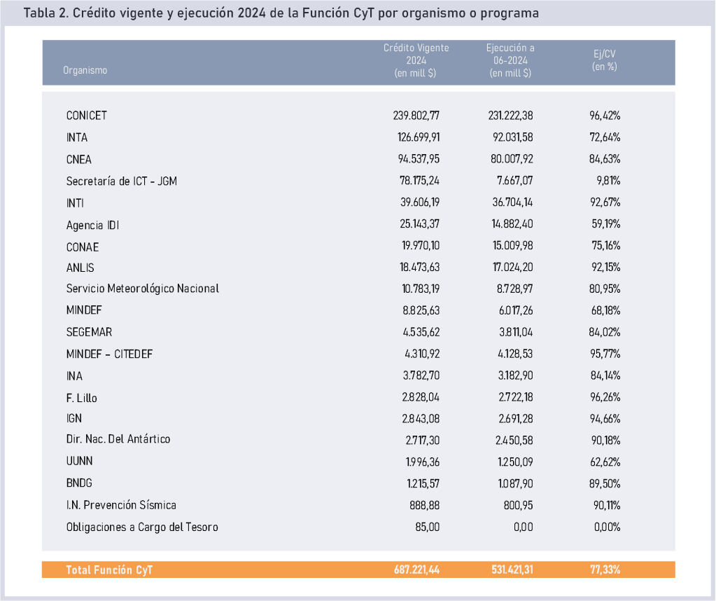 El informe destaca que la ejecución por organismo y programa muestra un cuadro general de saturación creciente, encontrando un extremo en el CONICET, que en tan solo 6 meses ya devengó el 96% de su Crédito Vigente (CV): «trece de los diecinueve organismos y programas que componen el SNCTI en la FCyT superan el umbral del 80% de ejecución de su crédito, para una media del sistema que alcanza el 77,3%, cuando según la distribución teórica no deberían haber consumido más del 43,5% del mismo al 30/06″.
