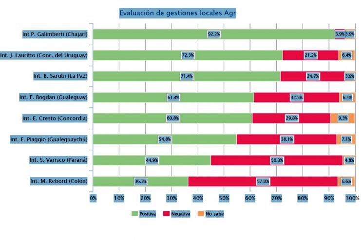 El gobierno de José Eduardo Lauritto tiene una estimación positiva del 74 por ciento; la de Enrique Cresto 60 por ciento y la de Martín Piaggio 54. Las buenas notas a estas administraciones y las derrotas a mano de la oposición es el claro ejemplo de la nacionalización de la elección y la decisión del votante de acompañar o castigar a Mauricio Macri.