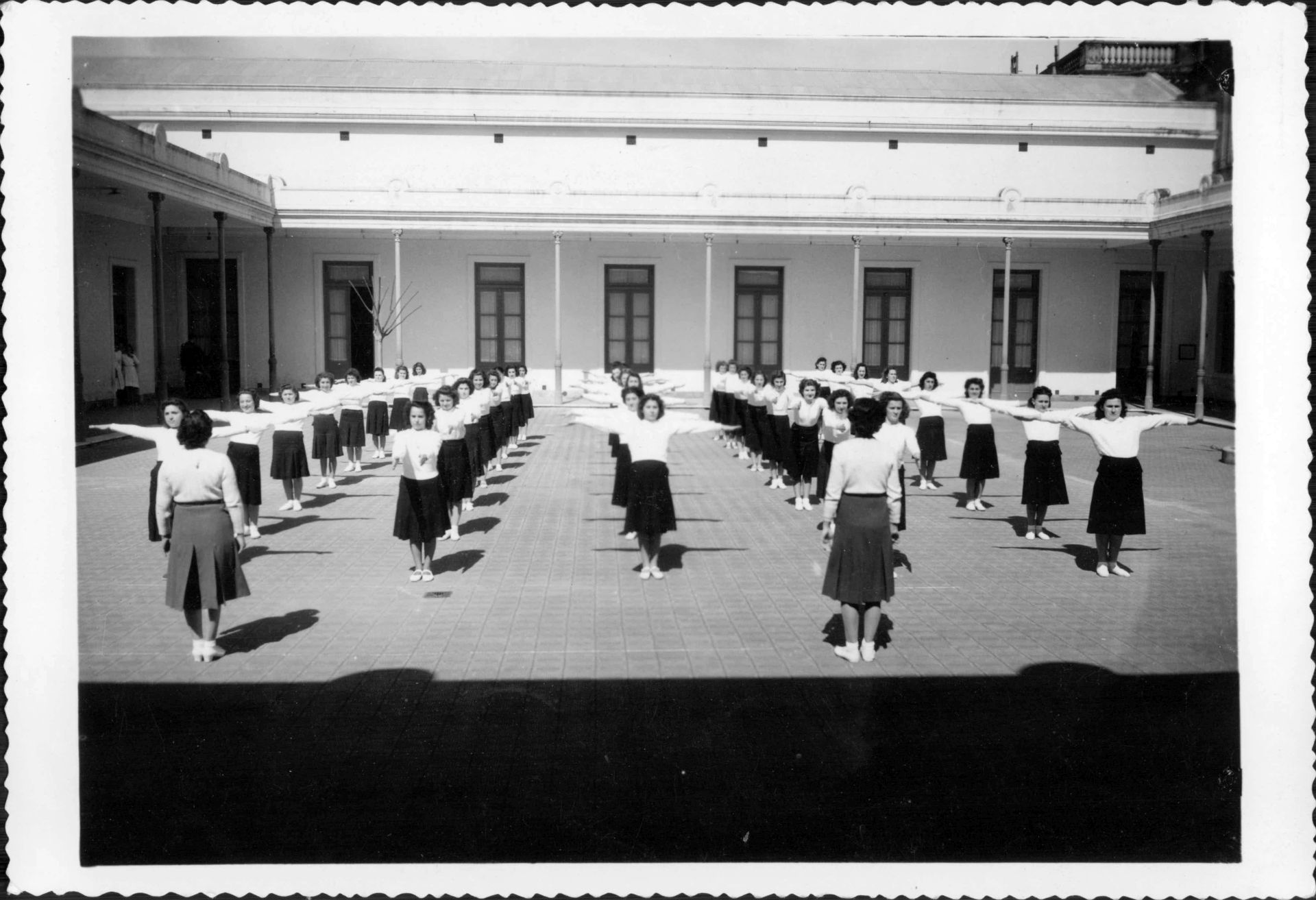 Clase de Gimnasia, en Patio Escuela Normal hacia la década de 1940, perteneciente al fondo fotográfico / documental del Archivo General de la Nación.