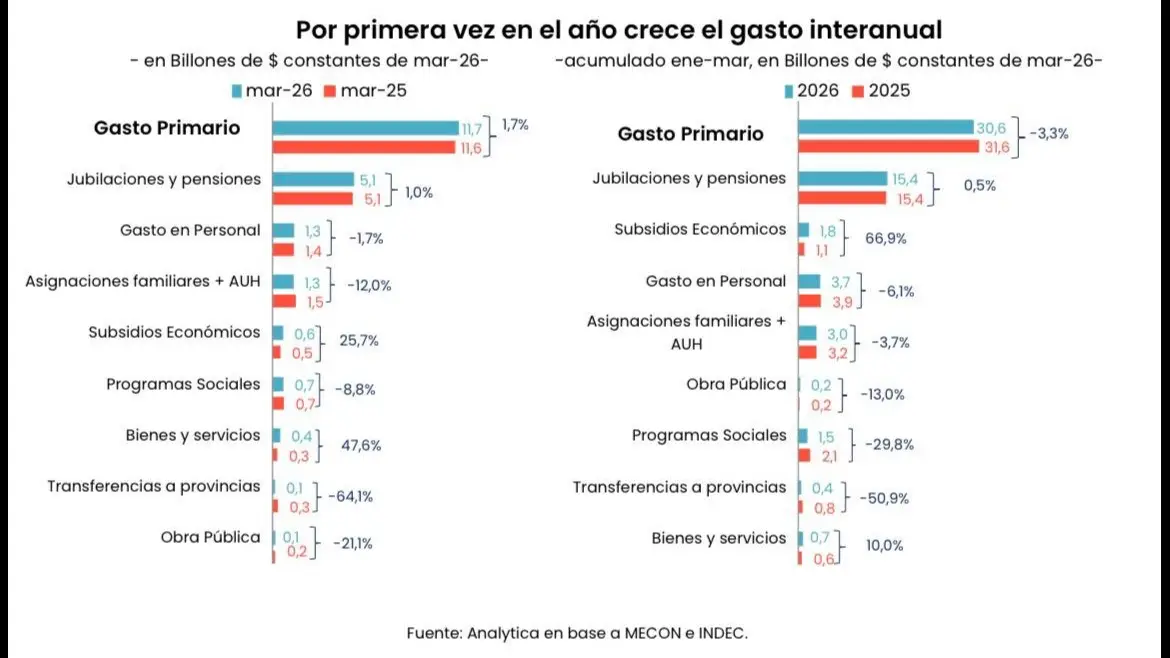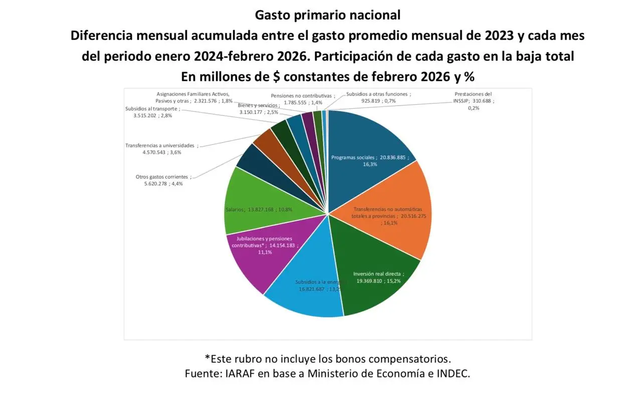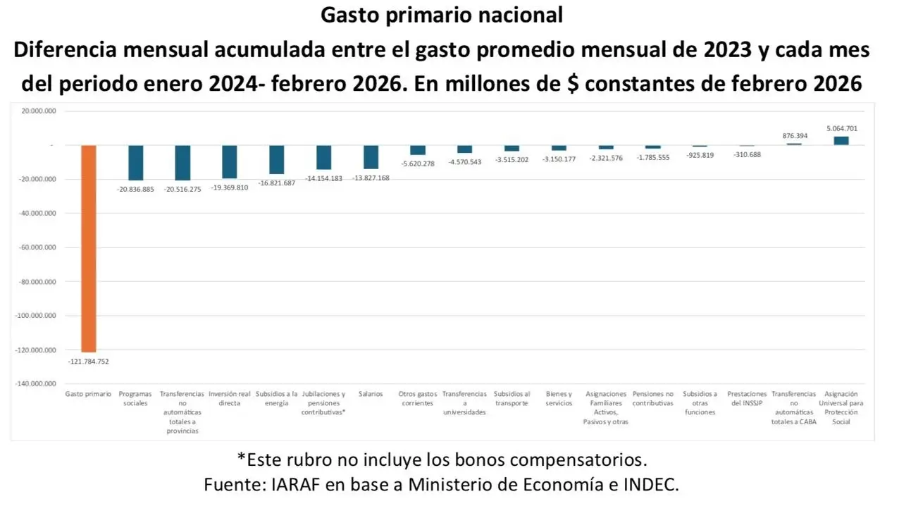 En términos absolutos, el mayor recorte que hizo Milei recae justamente en los programas de asistencia social, que perdieron más de $20,8 billones, según un cálculo del Instituto Argentino de Análisis Fiscal (IARAF), sobre un ajuste total de $121,7 billones, a precios constantes de febrero de 2026.