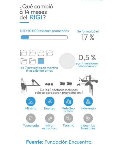 De acuerdo a un informe de la Fundación Encuentro, el Gobierno informó inversiones en el marco del RIGI por 50.000 millones de dólares. Solamente se aprobaron proyectos por 8.000 millones de inversiones que ya habían sido anunciadas. Los cambios normativos para militarizar los territorios y los proyectos económicos vinculados al RIGI.
