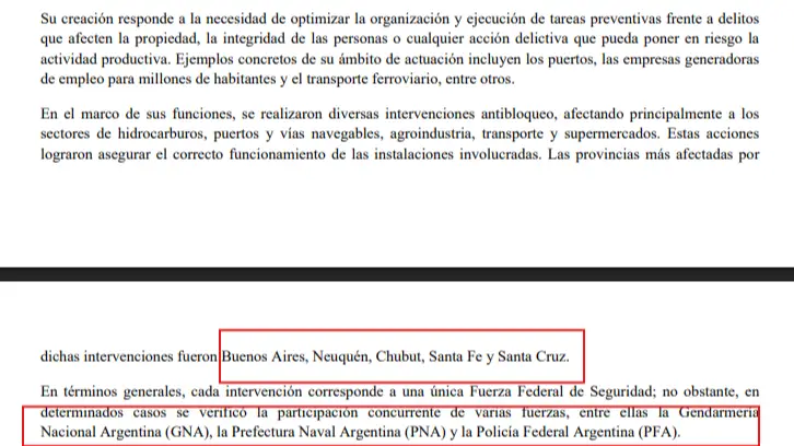 En esta línea, la administración Nacional realizó “diversas intervenciones antibloqueo, afectando principalmente a los sectores de hidrocarburos, puertos y vías navegables, agroindustria, transporte y supermercados. “Estas acciones lograron asegurar el correcto funcionamiento de las instalaciones involucradas. Las provincias más afectadas por dichas intervenciones fueron Buenos Aires, Neuquén, Chubut, Santa Fe y Santa Cruz”, respondieron desde Seguridad.