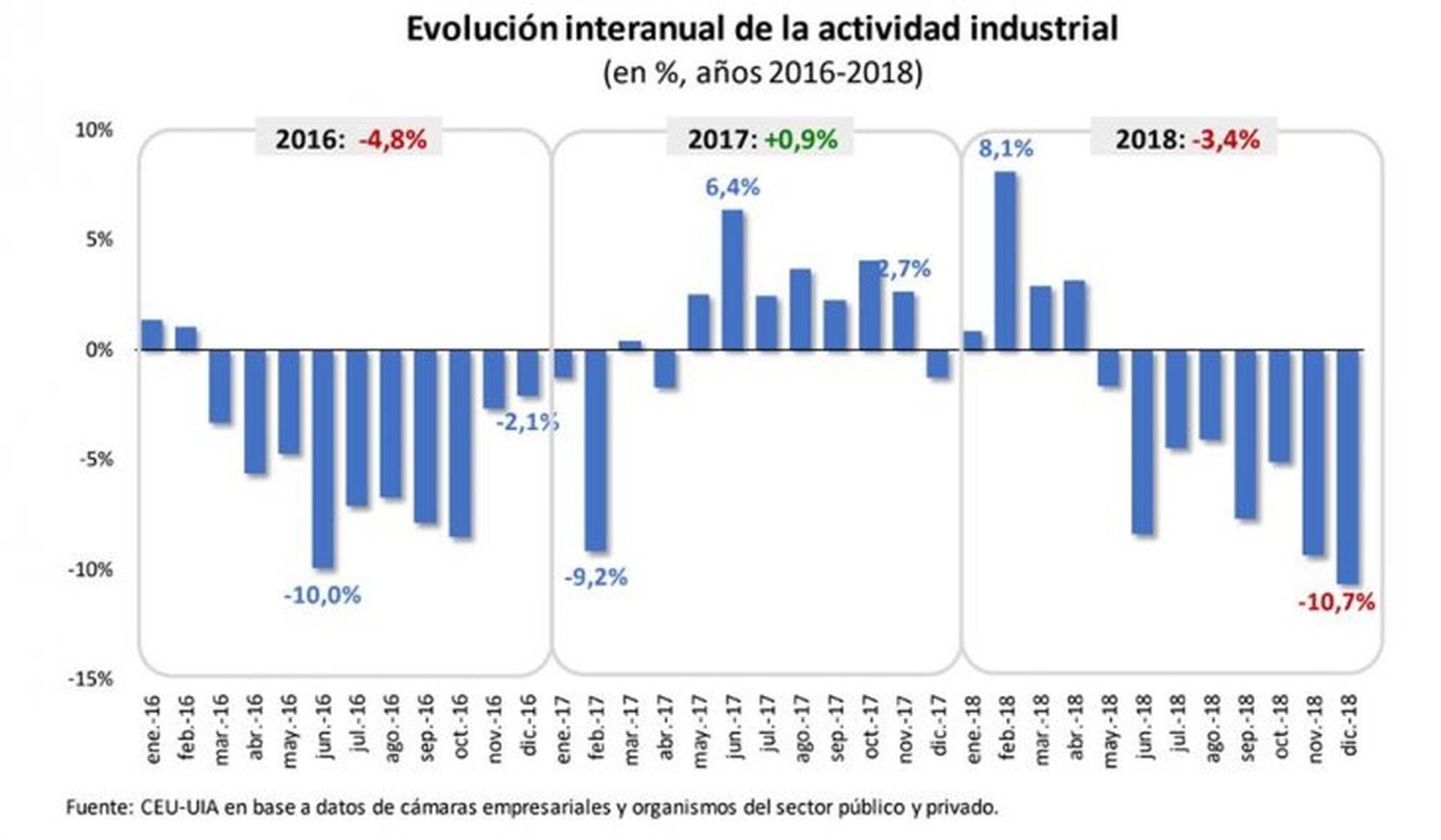 La actividad industrial sufrió una fuerte contracción en diciembre, al caer un 10,7% frente al mismo mes de 2017 y cerró el año con una caída 3,4%, informó la Unión Industrial Argentina (UIA).