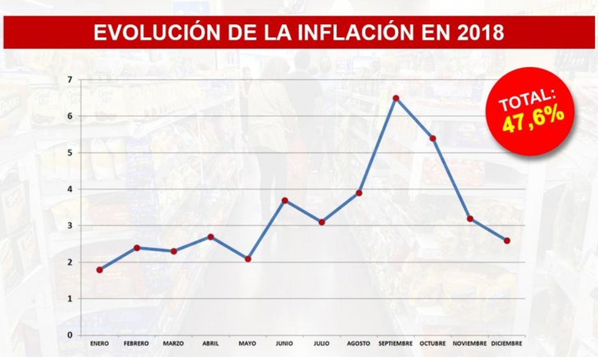 El índice de Precios al Consumidor (IPC-Costo de Vida) aumentó 2,6% en diciembre y acumuló un alza del 47,6% durante el 2018, la más alta en 27 años, según informó este martes el Instituto Nacional de Estadística y Censos (Indec).