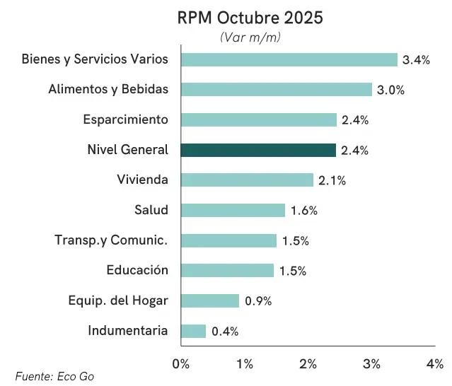 El balance de octubre cerró 0,1 puntos por encima de lo registrado en septiembre. Durante las primeras cuatro semanas del mes, con el tipo de cambio al alza y ante la expectativa de las elecciones, la inflación registrada en alimentos anotó subas semanales de entre el 0,5% y 0,9%. Tras el triunfo del oficialismo, la dinámica tendió a moderarse y la ultima semana registró una suba del 0,2%.
