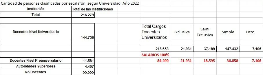 Sin embargo, en el caso de los docentes, una cosa son las «personas» y otra qué cargos se pagan. Una persona puede tener varios cargos simples y no todos los cargos cuentan con la misma cantidad de horas. Si se llevaran los cargos docentes a la categoría «exclusiva» (ocho horas diarias o el equivalente a 40 semanales) la ecuación cambia. Por ende, se contabilizarían 84.490 cargos universitarios, de los cuales 21.931 son de modalidad exclusiva, 18.595 semi exclusiva, 36.858 simple y 7.106 para la categoría «otro».