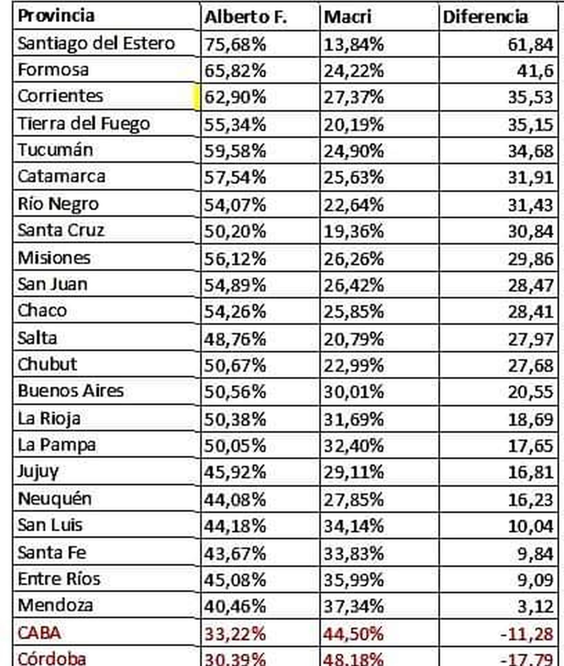 Diferencias entre el Frente para Todos y Juntos para el Cambio por provincia