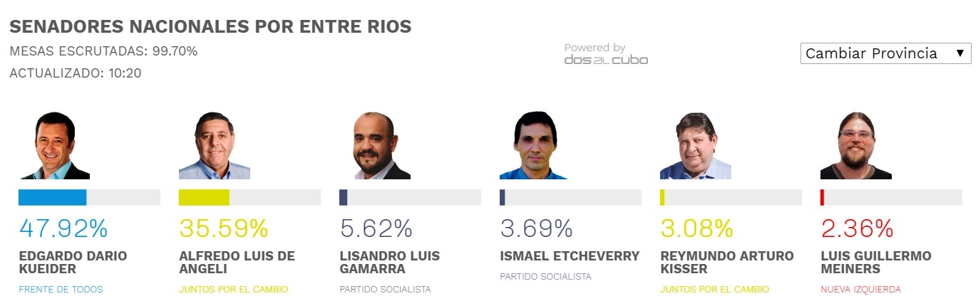 Futuro Entrerriano fue acompañado por 22.606 votos, el 7,79 por ciento del electorado y, por último quedó Defensores del cambio con 5677 votos, el 1,95 por ciento.