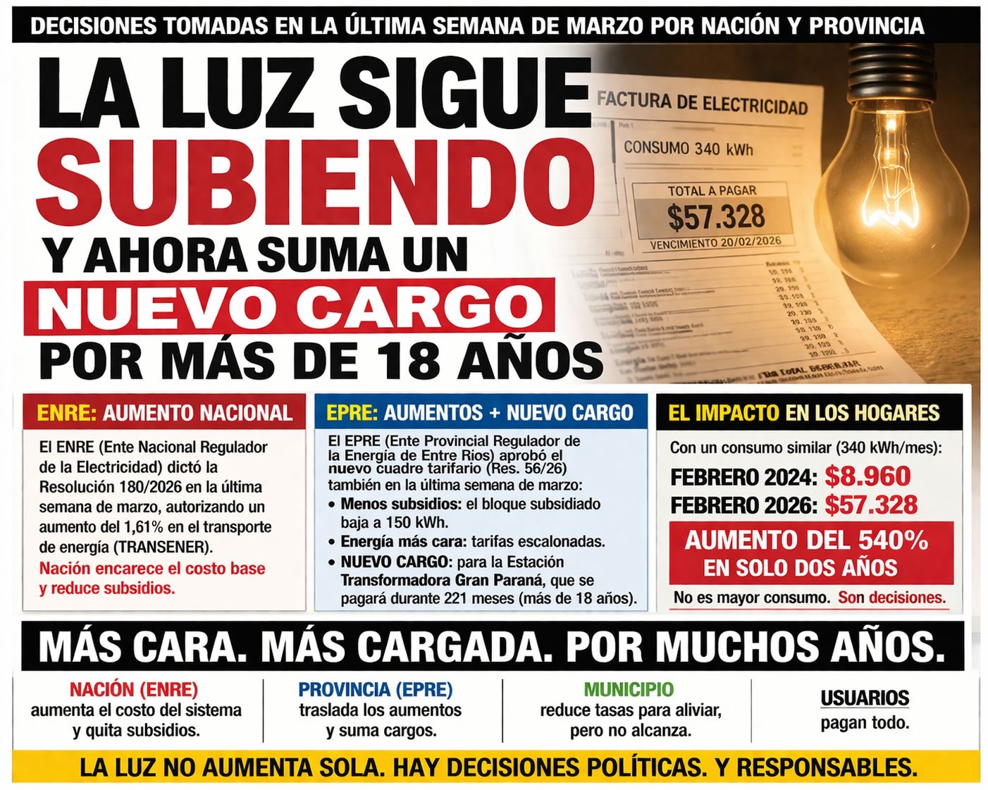 También en la última semana de marzo, el EPRE —organismo que regula el servicio eléctrico en la provincia— aprobó, mediante resoluciones como la 56/26, el nuevo cuadro tarifario que traslada estos aumentos nacionales directamente a los usuarios entrerrianos.