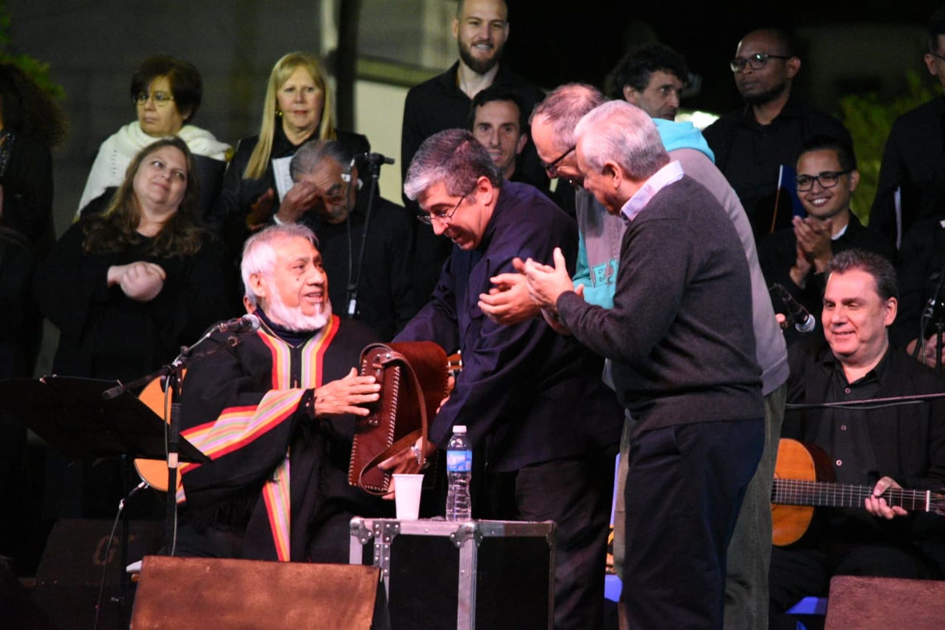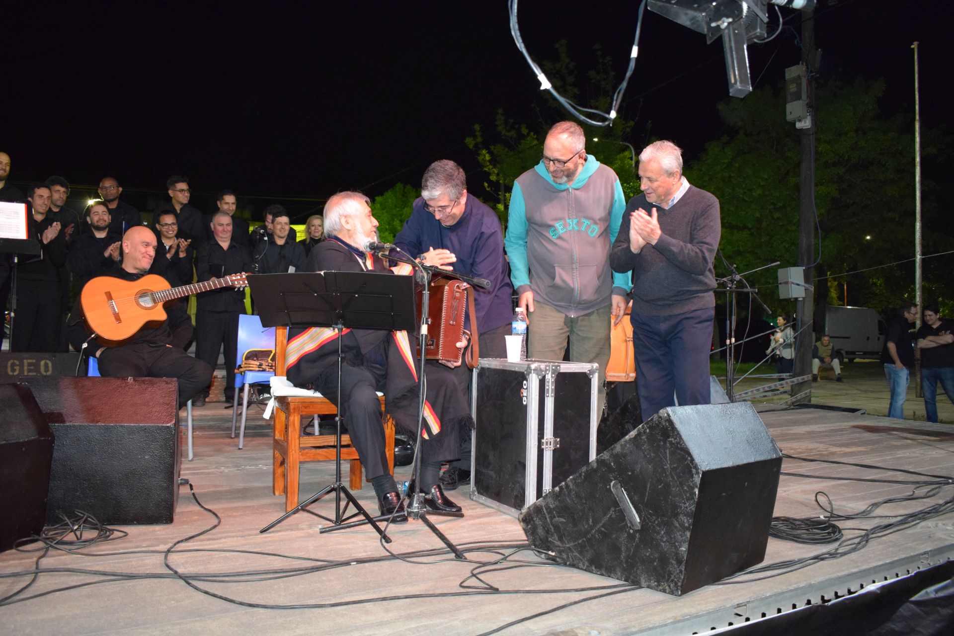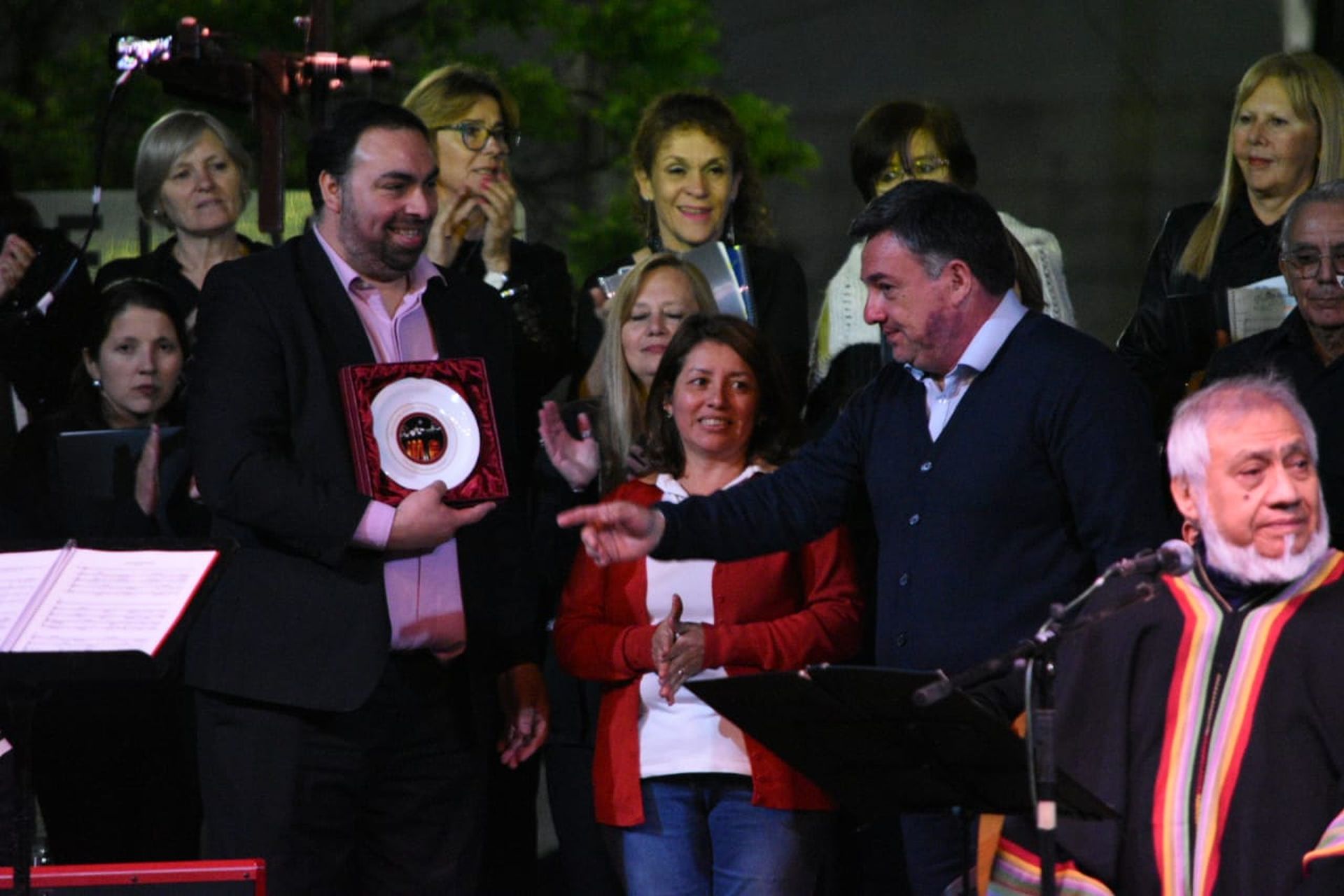 Al finalizar el espectáculo, el intendente José Lauritto y el presidente del Concejo Deliberante, Martín Oliva, entregaron obsequios a Zamba y al director del Ensamble Coral, Eduardo Retamar. Lo hicieron junto a los sacerdotes representantes de la obra de Don Bosco en nuestra ciudad.
