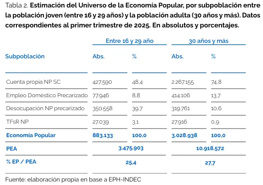 Según el relevamiento al que accedió este medio, la población joven (16–29 años) representó el 25,4% de este sector del trabajo y creció en el último año incluso por arriba del total (+10,9% interanual). Por su parte, la población adulta abarcó el 27,7% del total y se incrementó 5,8%, con un peso central del cuentapropismo de bajo capital. Por su lado, la economía popular representó el 24,2% de la PEA masculina y el 30,9% de la femenina. Mientras que entre varones predomina el cuentapropismo, en las mujeres se combinan empleo doméstico, cuentapropismo y desocupación, reforzando las desigualdades de género.