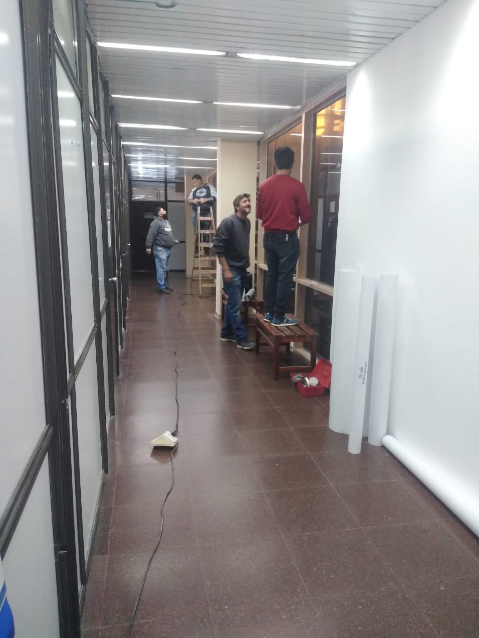 Se pintaron el techo, las columnas y los marcos de los ventanales cambiándose los colores originales de cuando se inauguró el edificio en 1984. También se plotearon todos los vidrios para cambiar la estética y generar un ámbito confortable tanto para el empleado como para quienes llegan desde el exterior al edificio de la Municipalidad y prepararlo para el objetivo final.