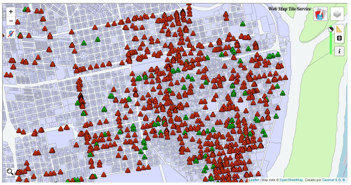 Hasta el momento se relevaron 1074 baches, mientras que fueron relevados 132. Los baches relevados se localizan con un color rojo, mientras que los arreglados se apreciar con un color verde. En ambos casos, se puede hacer click arriba de cada bache informándose día, hora del registro y el estado en que se encuentra.