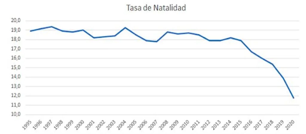 La tasa de natalidad, el número de nacimientos por cada 1000 habitantes también registra una caída constante desde 2014, ubicándose en 11,8 en 2020.