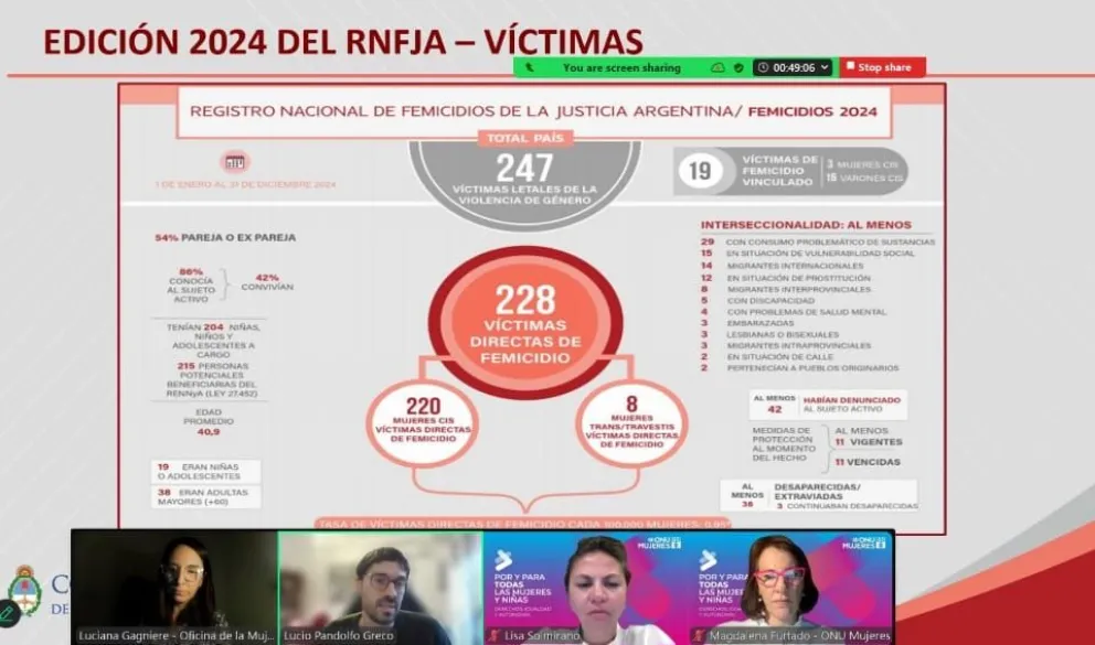 Se señaló que en el 2024 se registraron 247 víctimas letales de la violencia de género, registrándose una tasa de 0,95 víctimas directas de femicidio cada 100.000 mujeres.