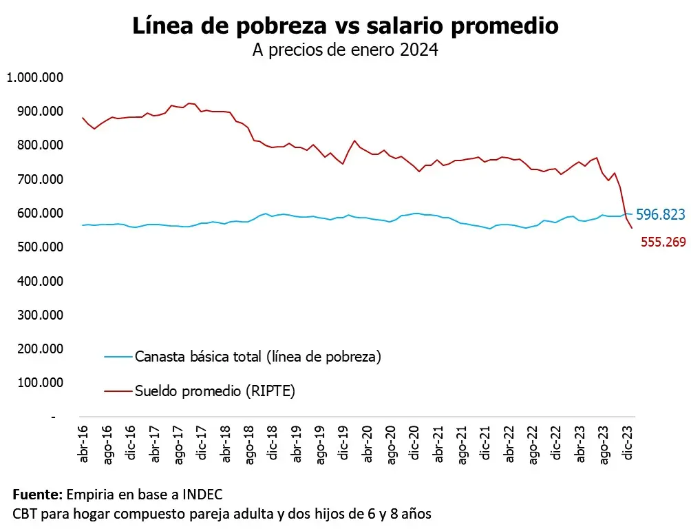 Un aspecto no menor es que “en el último año, subió más de 6 puntos la pobreza entre las chicas y chicos que viven en hogares liderados por asalariados formales”. Esto quiere decir que aún en familias con trabajo registrado resulta difícil hacer frente a las crecientes situaciones de pobreza. Se trata del fenómeno conocido como “trabajadores pobres” mencionado en el último panorama regional que presenta la Organización Internacional del Trabajo (OIT) referido a trabajadores que aún teniendo empleo con derechos no llegan a cubrir la canasta básica de alimentos y servicios, debido a “la aceleración inflacionaria y a su impacto negativo sobre el poder adquisitivo de los salarios». Tal como lo muestra el gráfico más abajo, elaborado por la consultora Empiria, la evolución de un salario promedio registrado está por debajo del valor de la Canasta Básica Total para un grupo familiar de dos adultos y dos menores. A su vez, hay que considerar el permanente incremento de la brecha de pobreza entre los hogares formales y los informales, que creció 7 puntos en el período analizado. “La pobreza monetaria es altamente sensible a los movimientos del ciclo económico: aumenta en épocas de crisis y de recesión y se reduce durante las recuperaciones. Esta dependencia opera fundamentalmente a través del mercado de trabajo, dado que el salario es la principal fuente de ingresos de la población”, señalaron desde UNICEF.