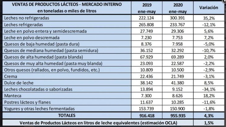 Por otra parte, la institución también registró una suba del 4,3% en el volumen de ventas de los productos lácteos para el mercado internos entre los meses de enero y mayo al pasar de 916.418 en 2019 a 955.935 litros en el presente año.