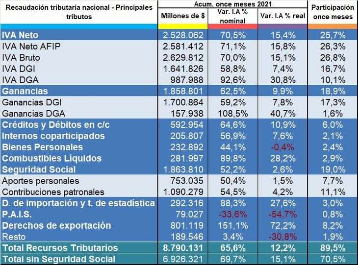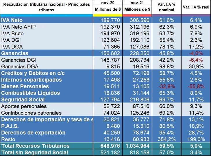 «En la suba de la recaudación, gran aporte de la recaudación de aportes y contribuciones a la seguridad social. La recaudación total sin Seguridad social acumulada en 11 meses, registró este año el nivel máximo de los últimos 6 años», destacó el director del Instituto Argentino de Análisis Fiscal (IARAF), Nadin Argañaraz. «Descontada la inflación, la variación real de la recaudación total fue del 5%», agregó.