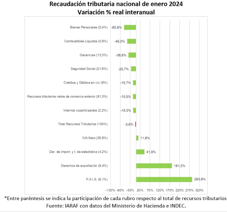 Según estimaciones del Instituto Argentino de Análisis Fiscal (IARAF), la recaudación cayó en términos reales 3,9% respecto de enero del 2023. «Al excluir la recaudación por tributos vinculados al comercio exterior, la variación real interanual habría sido del -15,5%», señala el IARAF.