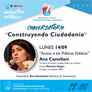 En esta oportunidad estará acompañando el sociólogo investigador y Docente Mariano Negro de Uner y modera todo el ciclo la Directora de Comunicación Ciudadana Ana Hernández .El evento está organizado por la municipalidad de Concepción del Uruguay a través de la Dirección de Comunicación Ciudadana.Se trasmitira por las redes oficiales del municipio.