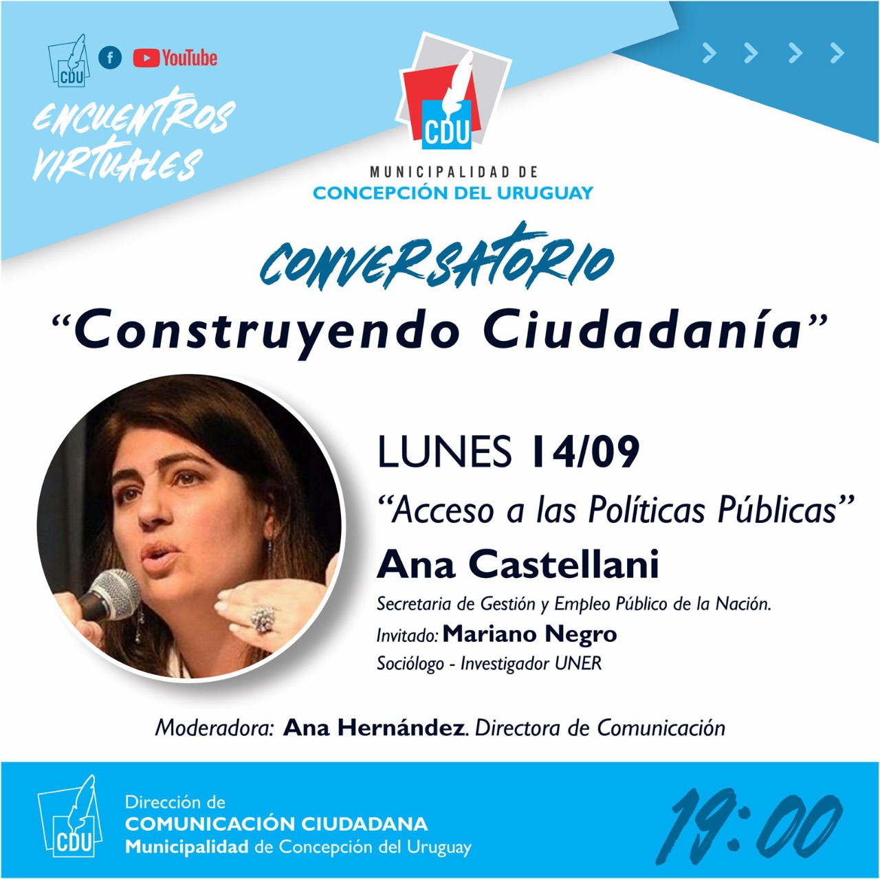 Ana Castellani en el segundo encuentro del Conversatorio “Construyendo Ciudadanía”. La Secretaria de Gestion y Empleo Publico de la Nación estará presente en el conversatorio virtual este lunes realizará este lunes 14 a las 19 horas.