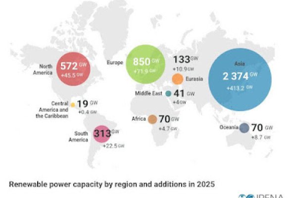 La capacidad de energía renovable mantiene su crecimiento en el mundo, pero con una brecha que se amplía entre regiones, por ejemplo entre Asia y África, advirtió este jueves 10 un reporte de la Agencia Internacional de Energías Renovables (Irena).