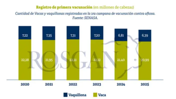Según los datos consolidados al primer semestre, el total de vacas vacunadas este año ascendían a los 20,9 millones, mientras que un año atrás eran 21,4 millones. En 2020, pleno año de la pandemia, se habían vacunado más de 22 millones de vacas 7,2 millones de vaquillonas.