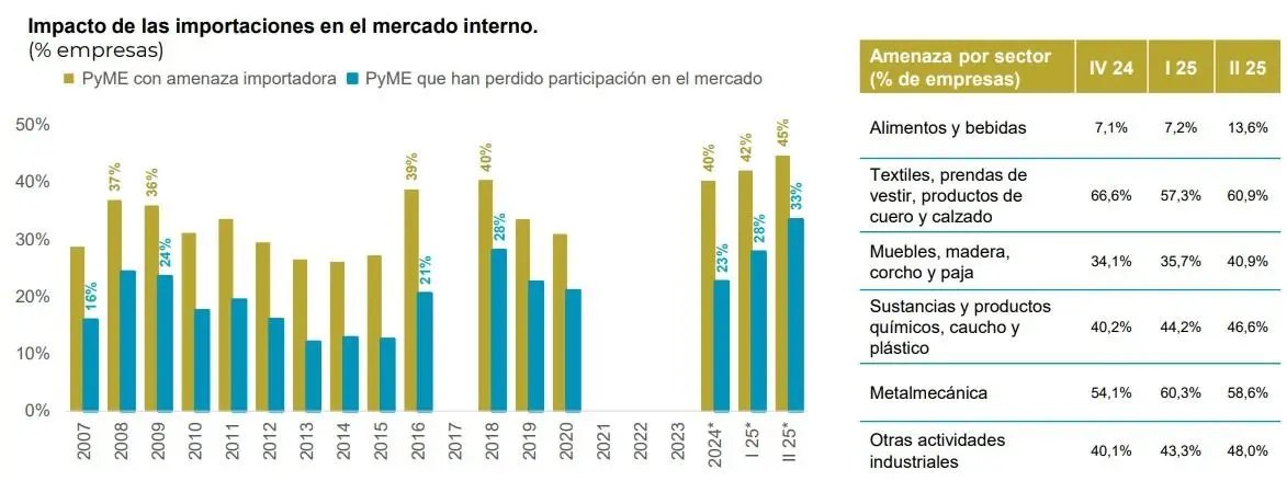 El 45% de las empresas informó amenazada importadora y el 33% verificó pérdida de participación a manos de importaciones. «Ambos indicadores se ubican en niveles récord, con China como principal origen de la amenaza (73% de las empresas bajo amenaza)», sostuvo el Observatorio fundado por Techint.