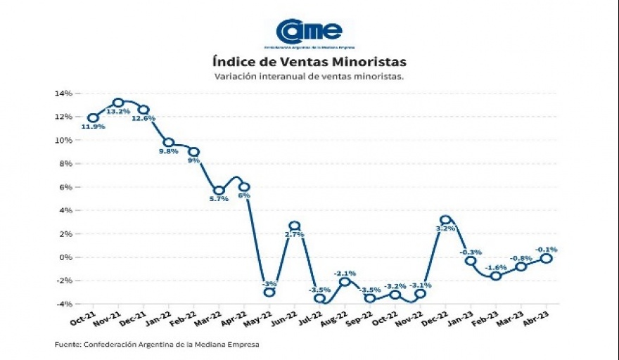Así surge del Índice de Ventas Minoristas Pymes de la Confederación Argentina de la Mediana Empresa (CAME), elaborado en base a un relevamiento mensual entre 1.228 comercios minoristas del país, realizado del 2 al 5 de mayo.