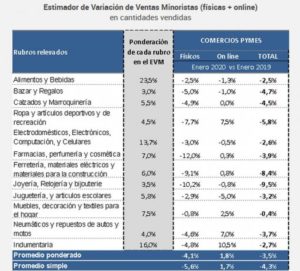 Las ventas minoristas de las Pequeñas y Medianas Empresas (Pymes) cayeron 3,5% en enero frente a igual mes del año pasado, según un informe elaborado por la Confederación Argentina de la Mediana Empresa (CAME).