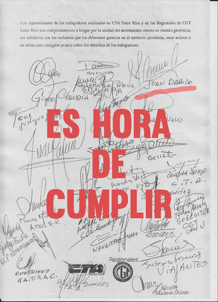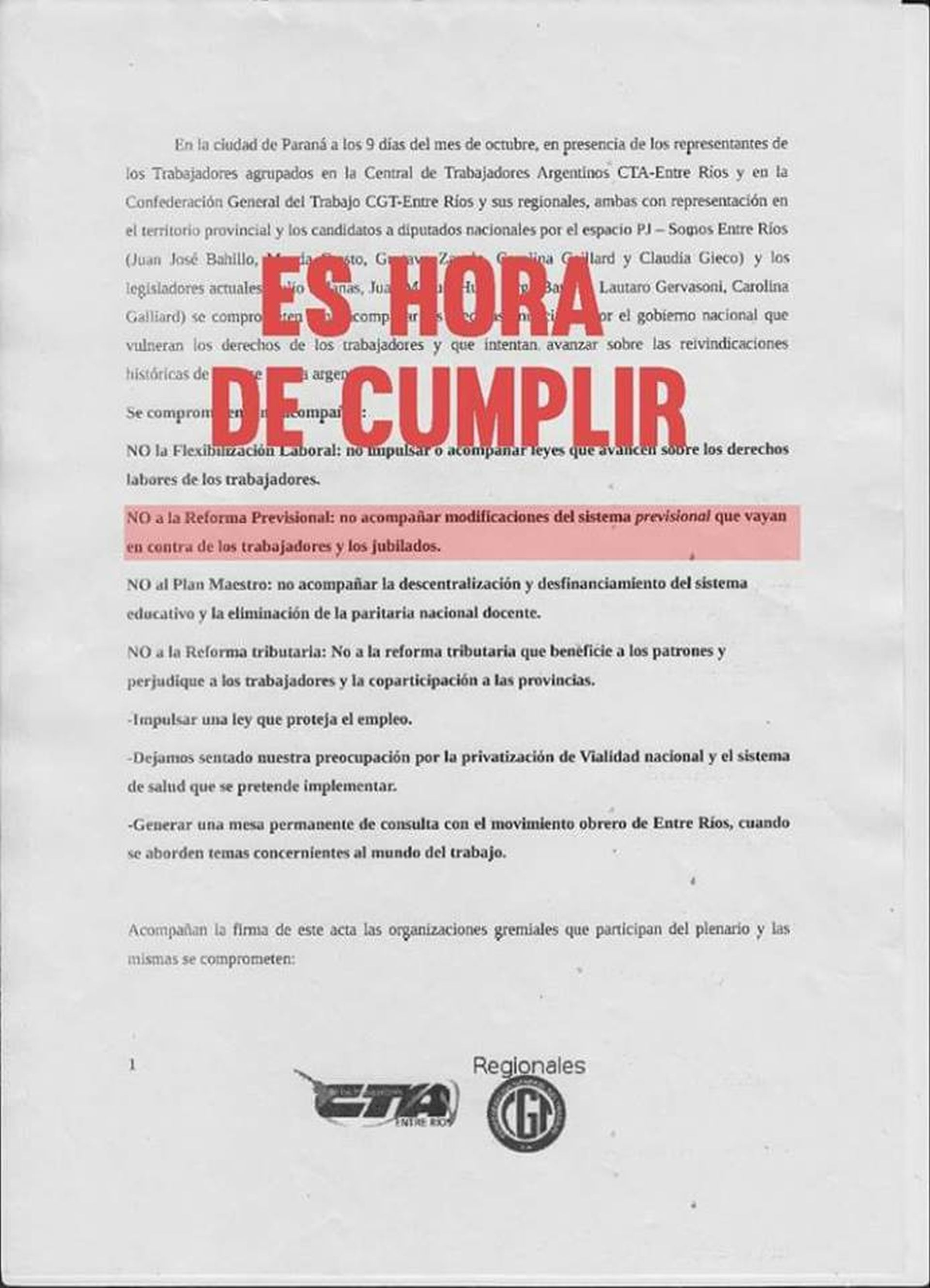 En octubre pasado, la CTA Entre Ríos y la CGT recibieron a los candidatos del Frente Somos Entre Ríos, Juan José Bahillo, Gustavo Zavallo y Claudia Gieco, además de los actuales diputados nacionales del Frente para la Victoria, Juan Manuel Huss y Jorge Barreto. En el encuentro, los candidatos firmaron un acta comprometiéndose a no modificar ninguna ley como las que tiene en agenda el gobierno nacional después del 22 de octubre. Entre ellas, fueron incluidas la flexibilización laboral, el cambio de la ley previsional, el Plan Maestro, la reforma tributaria, la privatización de Vialidad y cambios en la salud pública.