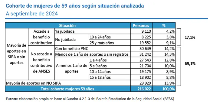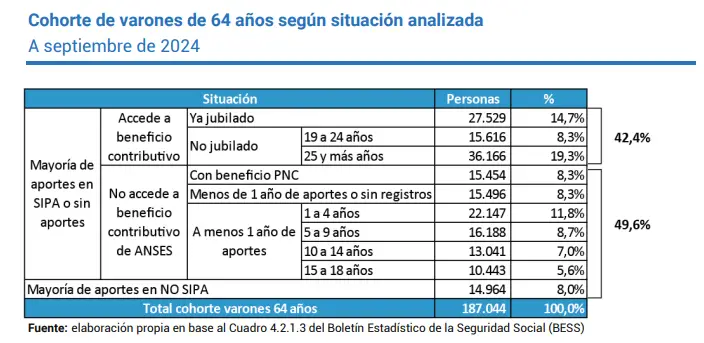 En 2024 un total de 187.044 varones cumplieron la edad de 64 años, mientras que unas 216.022 mujeres llegaron a 59 años de edad, es decir, que más de 400.000 personas se acercaron a la edad próxima de jubilación (65 años para ellos y 60 para ellas). Sin embargo, más de la mitad no va a poder acceder al derecho a un ingreso de subsistencia en la vejez ya que, pese a haber trabajado la mayor parte de su vida, no cuentan con los aportes suficientes establecidos por ley (30 años).