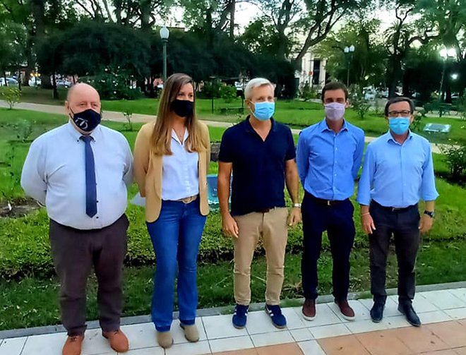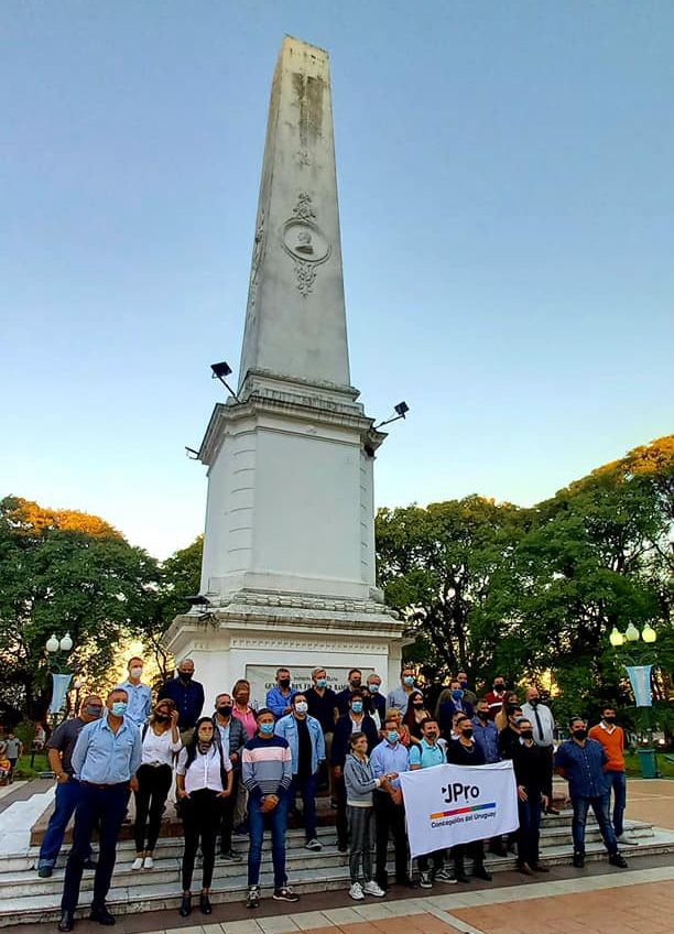 El periplo del macrista incluyó una sesión de fotos en la pirámide de la plaza principal «con concejales, jóvenes, intendentes y presidentes de juntas de gobierno de Juntos por el Cambio del departamento Uruguay». Entre los ediles estaba el único concejal vecinalista que ingresó al cuerpo deliberativo de la ciudad, Aldo Montañana, electo en por lista de Aníbal Steren.