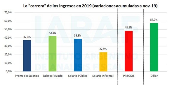 En noviembre, los salarios privados subieron un 2,8% y los públicos un 1,7%, mientras que los salarios informales aumentaron 2,3%. Todos los grupos de asalariados perdieron contra la inflación de noviembre, que fue el dato más alto del año 2019.