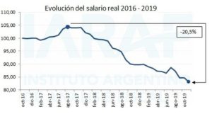 En el acumulado de once meses de 2019 el salario real promedio cayó un 7,4%, ya que mientras la inflación a nivel nacional alcanzó el 48,3%, en el período enero-noviembre los salarios aumentaron en promedio un 37,3%, arrojando una caída de poder adquisitivo respecto al nivel de fines de 2018.
