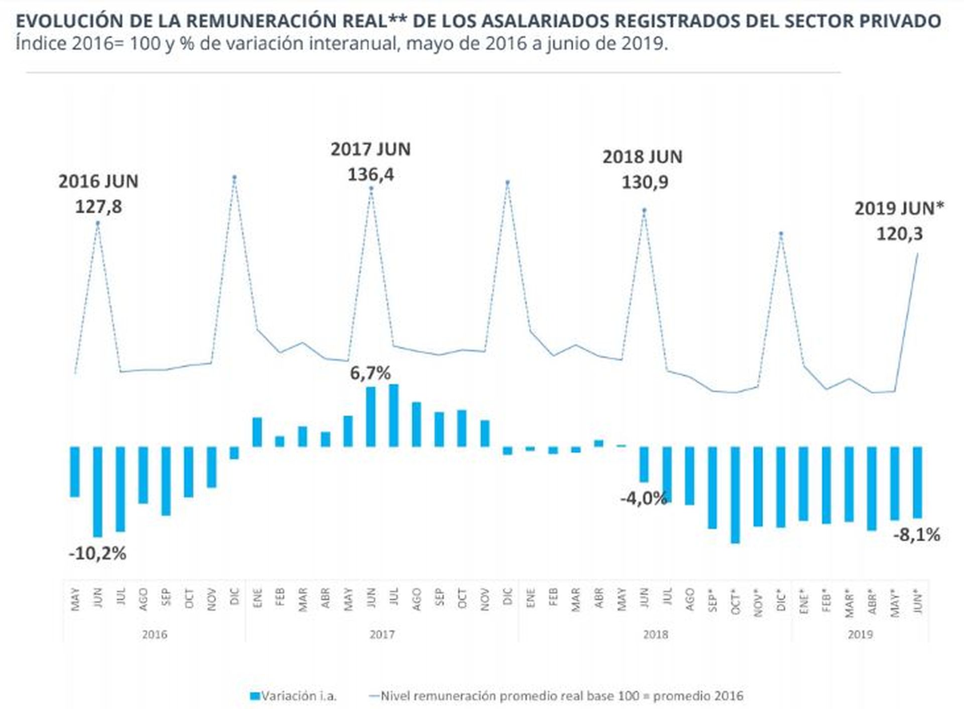 «El índice de salarios total verificó un incremento de 2,0% en junio de 2019 respecto de mayo de 2019, como consecuencia de la suba de los salarios registrados de 2,4% y un aumento en los salarios del sector privado no registrado de 0,2%», señaló el Indec.