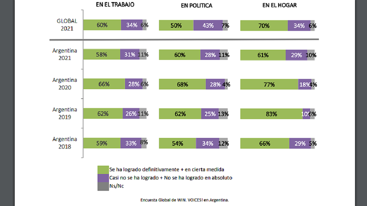 En Argentina 6 de cada 10 encuestados perciben que existe igualdad de género en el trabajo (58%), en la política (60%) y en el ámbito doméstico (61%). Es interesante detenernos tanto en el comparativo global como en la evolución de estos datos en Argentina. Al comparar nuestro país con el promedio mundial, vemos que mientras que la percepción de la igualdad en el ámbito laboral está solo dos puntos por debajo que la opinión global (60% vs 58% global), en Argentina la percepción de la igualdad en política es más alta que el promedio mundial (60% vs 50% global), y por contraparte, la percepción de la igualdad en el hogar es menor en nuestro país que en el resto del mundo (61% vs 70%).