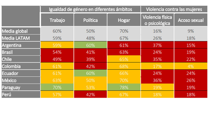 Si se observa lo que sucede en el ámbito regional Paraguay se destaca en el reconocimiento declarado de derechos de las mujeres en el trabajo (70%), seguido por México (63%), Ecuador y Colombia (61%), Argentina (59%), Perú (57%), Brasil (54%), siendo Chile el que presenta los menores niveles en este aspecto (49%).