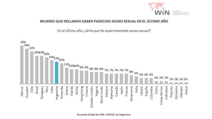 En el marco del Día de la Lucha contra el Acoso Sexual Callejero, se presentó la Encuesta Mundial de WIN y Voices (Argentina) sobre violencia, acoso sexual e igualdad de género realizada en 39 países. El estudio incluye datos de tendencia. «Las mujeres argentinas continúan al tope del ranking global en el sufrimiento de violencia y se detecta un leve aumento en la incidencia de acoso sexual con relación a la medición del año anterior», destacó el trabajo al que accedió Ámbito.