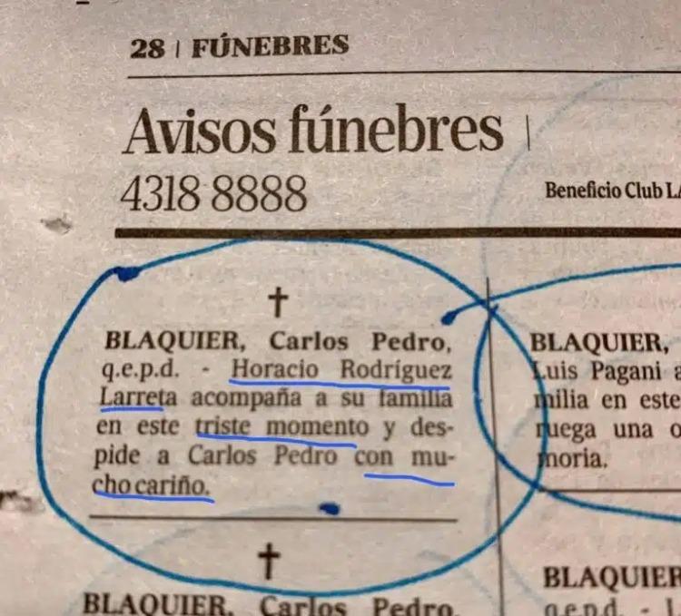 Por su parte, Larreta trató de pasar más desapercibido, y le dedicó un mensaje a través de un aviso fúnebre, en el diario La Nación. “Horacio Rodríguez Larreta acompaña a su familia en este triste momento y despide a Carlos Pedro con mucho cariño”, escribió el jefe porteño.