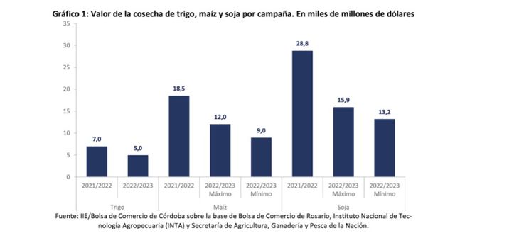 Tras alcanzar un récord de casi 55 mil millones de dólares en la campaña 2021/22, el informe proyecta el valor de la cosecha de los 3 principales cultivos (trigo, maíz y soja) entre u$s27.000 y u$s33.000 millones en la campaña 2022/23. Esto significa que caerá entre 40% y 50% frente al año previo.
