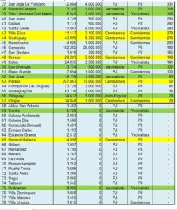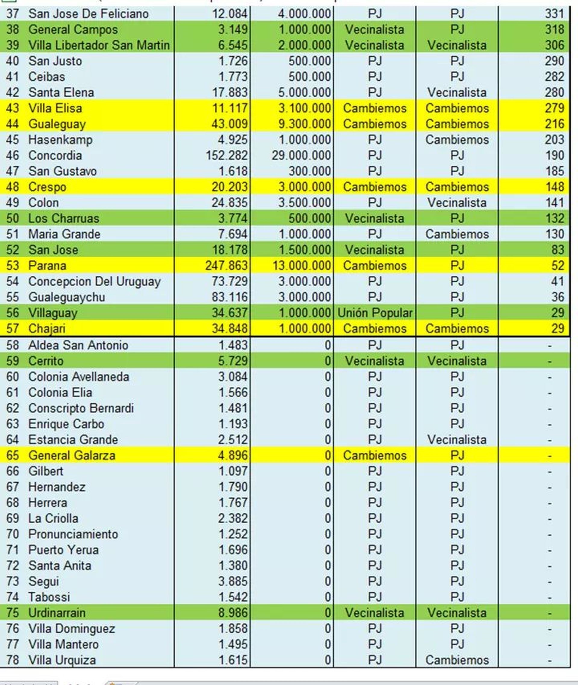 - A Paraná le dieron $ 13 millones, mientras a San Benito (JxC) le dieron 10,2 millones, a Viale (JxC) $ 7 millones, sin ninguna lógica poblacional. Nada para Seguí, Tabossi, Villa Urquiza, Colonia Avellaneda (todos del PJ). Para María Grande y Hasenkamp $ 1 millón cada uno (del PJ), pero a Hernandarias (JxC) $ 9,5 millones.