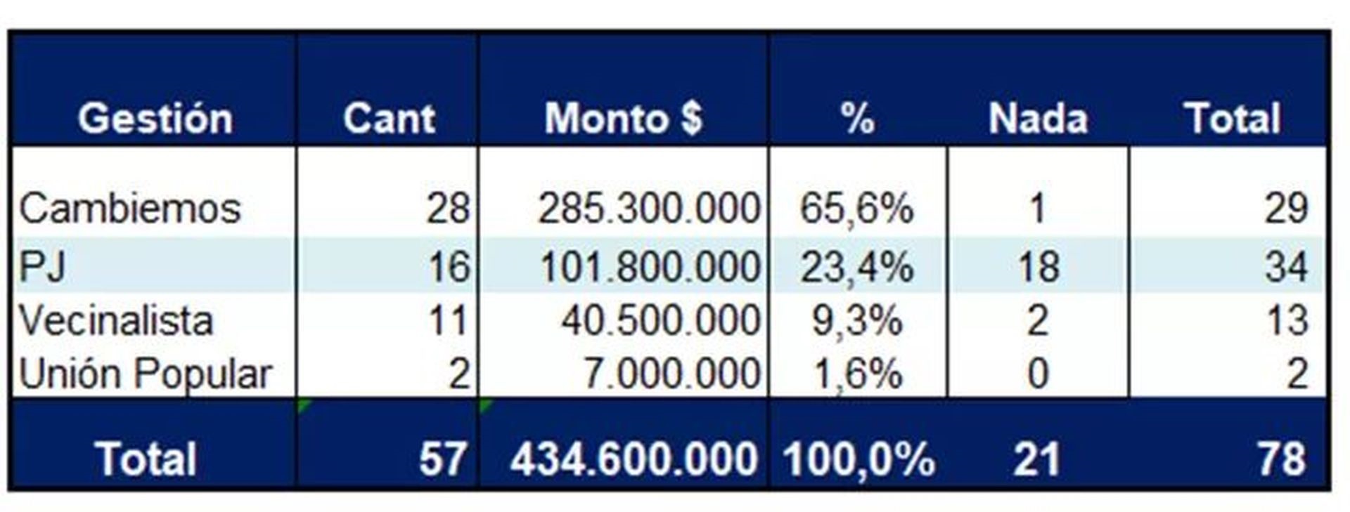 - También beneficiaron a los 11 Intendentes Vecinalistas que se mostraban más cercanos a la estrategia política nacional, utilizando $ 40,5 millones (el 9,3%) de los fondos. Pero otros vecinalistas, no tan funcionales, no recibieron nada.