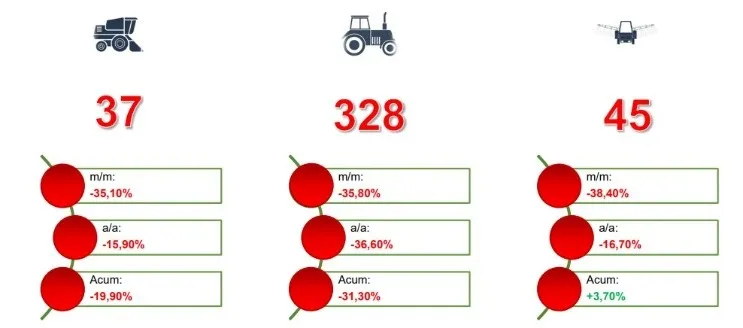 En cuanto a tractores, en junio se patentaron 328 unidades, una baja del 35,8% comparado contra las 511 unidades de mayo, y una baja del 36,6% si la comparación es interanual, ya que en junio de 2023 se habían registrado 517 unidades.