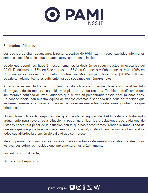 “Quiero transmitirles la seguridad de que, desde el equipo de PAMI, estamos trabajando arduamente para revertir esta situación y poder garantizar las prestaciones que cada uno de ustedes necesita a pesar de la situación con la que nos encontramos”, afirmó Leguízamo dirigiéndose a los afiliados. “Tengan la tranquilidad de que esta gestión pone la eficiencia al servicio de la salud, cuidando sus recursos y brindando a todos sus afiliados la atención de calidad que se merecen”, agregó el funcionario.