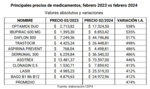 En el caso de los aumentos interanuales, por encima del 276,2% de inflación del segundo mes del año, «el promedio de los 10 medicamentos que más aumentaron en el último año alcanza una suba interanual del 474%. Por encima del promedio encontramos subas interanuales del 538% para OPTAMOX DUO y del 535% para IBUPIRAC 600 MG», indicó el estudio.